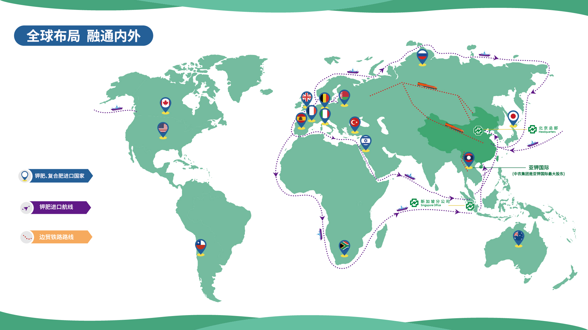 國內最大的化肥進出口商之一,國際采銷遍布世界主要化肥供應地和需求國,是國際肥料工業協會(IFA)會員單位,年進出口量最高達700萬噸。鉀肥年進口量超400萬噸,約占我國進口總量的40%。中農控股多年牽頭達成中國進口鉀肥聯合談判,持續推動中國保持全球鉀肥“價格洼地”地位。作為國內鉀肥保供穩價關鍵抓手,率先打通中歐班列、中老鐵路進口回運鉀肥新通道,穩定保障國內鉀肥供應和糧食豐收。