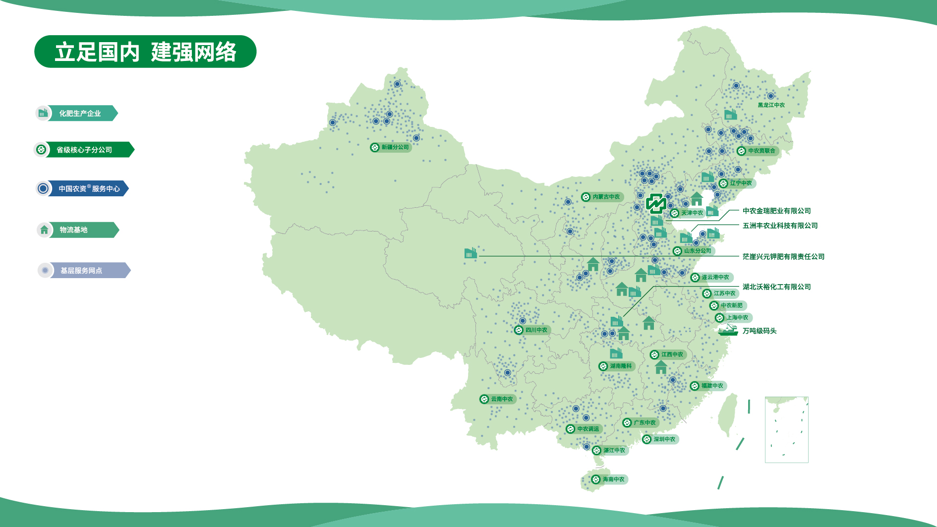 中農控股是國內最大的化肥貿易分銷商之一,年經營規模超過2800萬噸。擁有2萬余家基層網點,經營服務網絡覆蓋國內100%的糧食主產區、超92%的地級市和超70%的縣級行政區域。“中國農資”系列化肥是國內最具影響力的品牌之一。