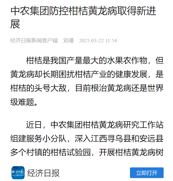 3月22日,經濟日報新聞客戶端刊發《中農集團防控柑桔黃龍病取得新進展》。
