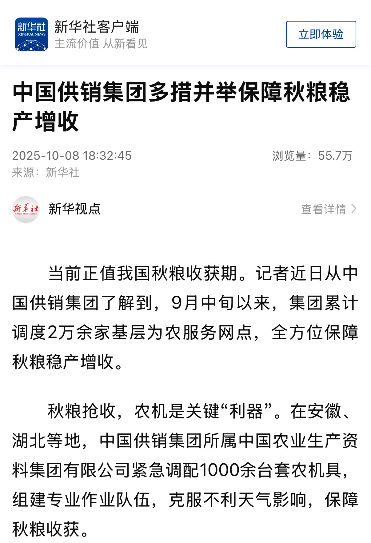 當前正值我國秋糧收獲期。記者近日從中國供銷集團了解到,9月中旬以來,集團累計調度2萬余家基層為農服務網點,全方位保障秋糧穩產增收。